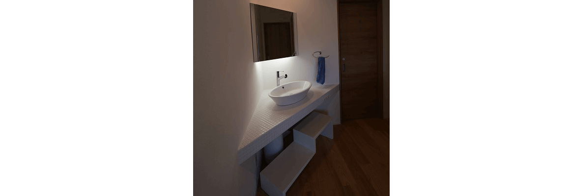 洗面カウンターの下の子供さん用踏み台はデザイン・製作野々村とのことです。